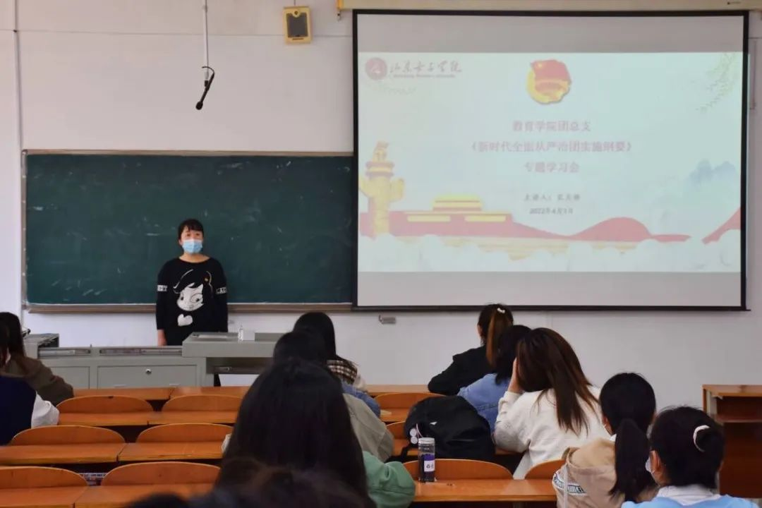 2022年4月3日,学院团总支副书记于博文楼101带领20级部分团支书与21级全体团支书举行《新时代全面从严治团实施纲要》专题学习会。