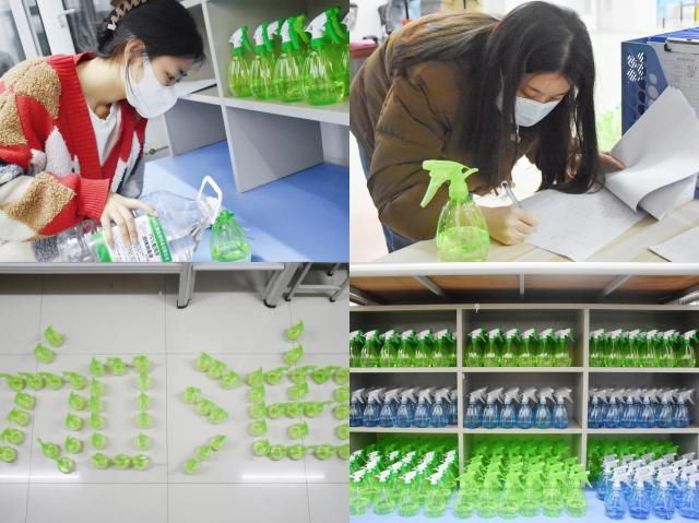 教育学院全体辅导员老师在结束了一天紧张工作后来到学生公寓进行酒精分装和发放,各班同学井然有序地排队领取消杀物资,大家在看到用酒精喷壶摆成的“加油”两字时,心中不禁泛起了阵阵暖意,更加坚定了师生同心抗疫的信心和决心。