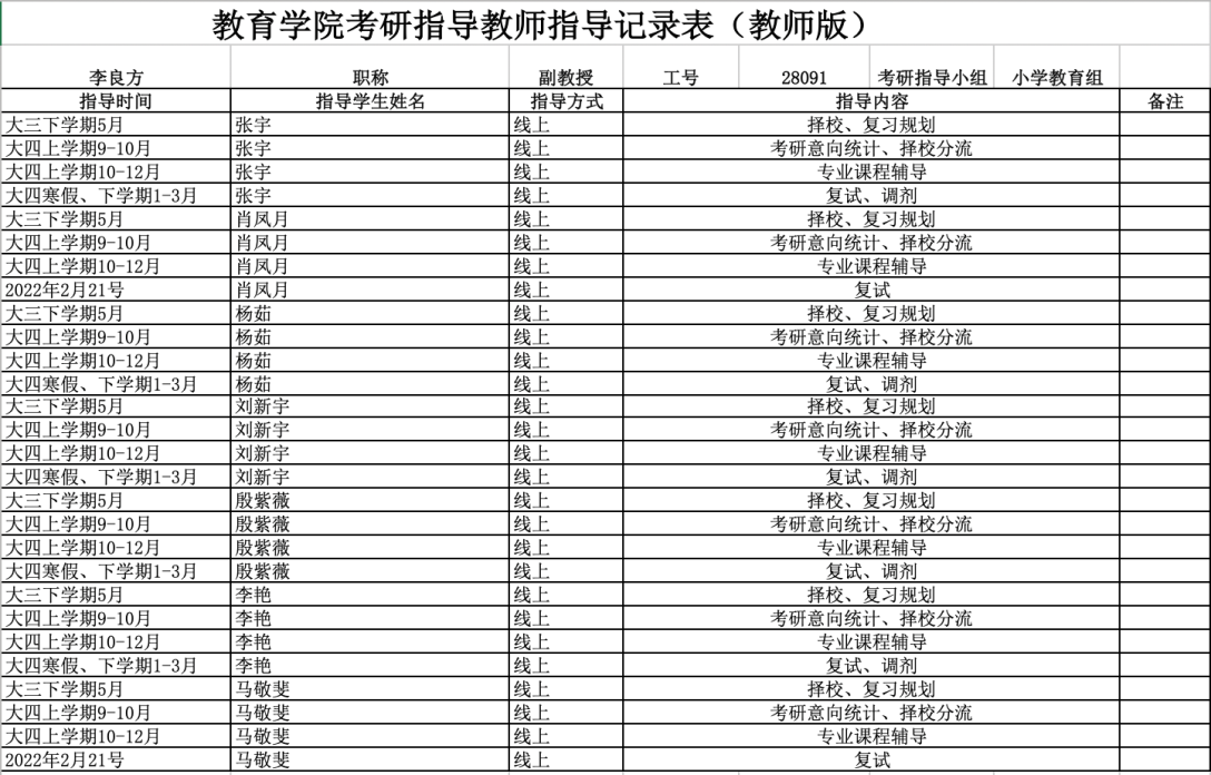 据不完全统计,教育学院2022届考研报名人数为143人,为针对性地对学生进行考研复试和调剂指导,教育学院公布了16位考研指导教师的相关信息,学生根据自己的报考专业和院校选择指导教师,指导教师本着“专业相近原则”组建相应的考研指导小组,对学生的笔试复习规划、择校分流进行指导,提供专业课程辅导,复试、调剂指导。