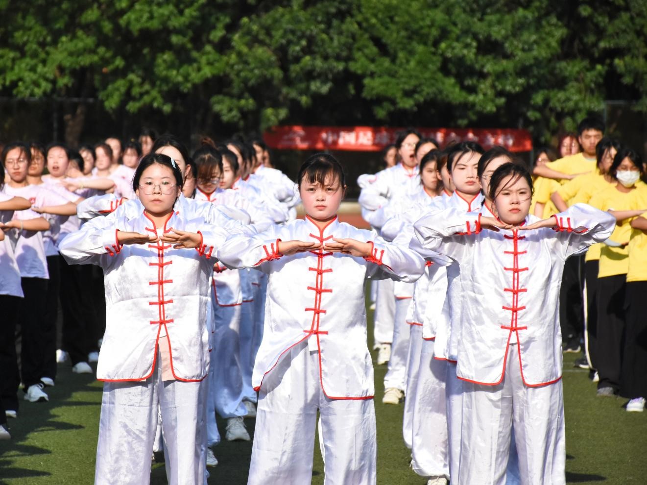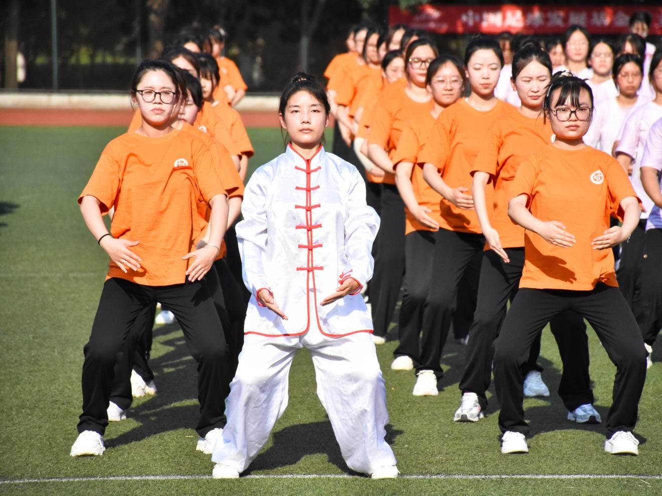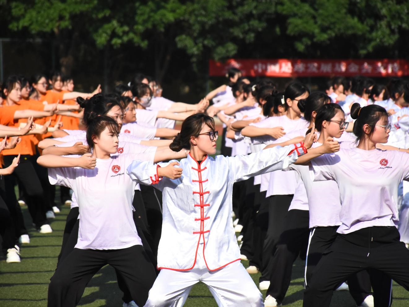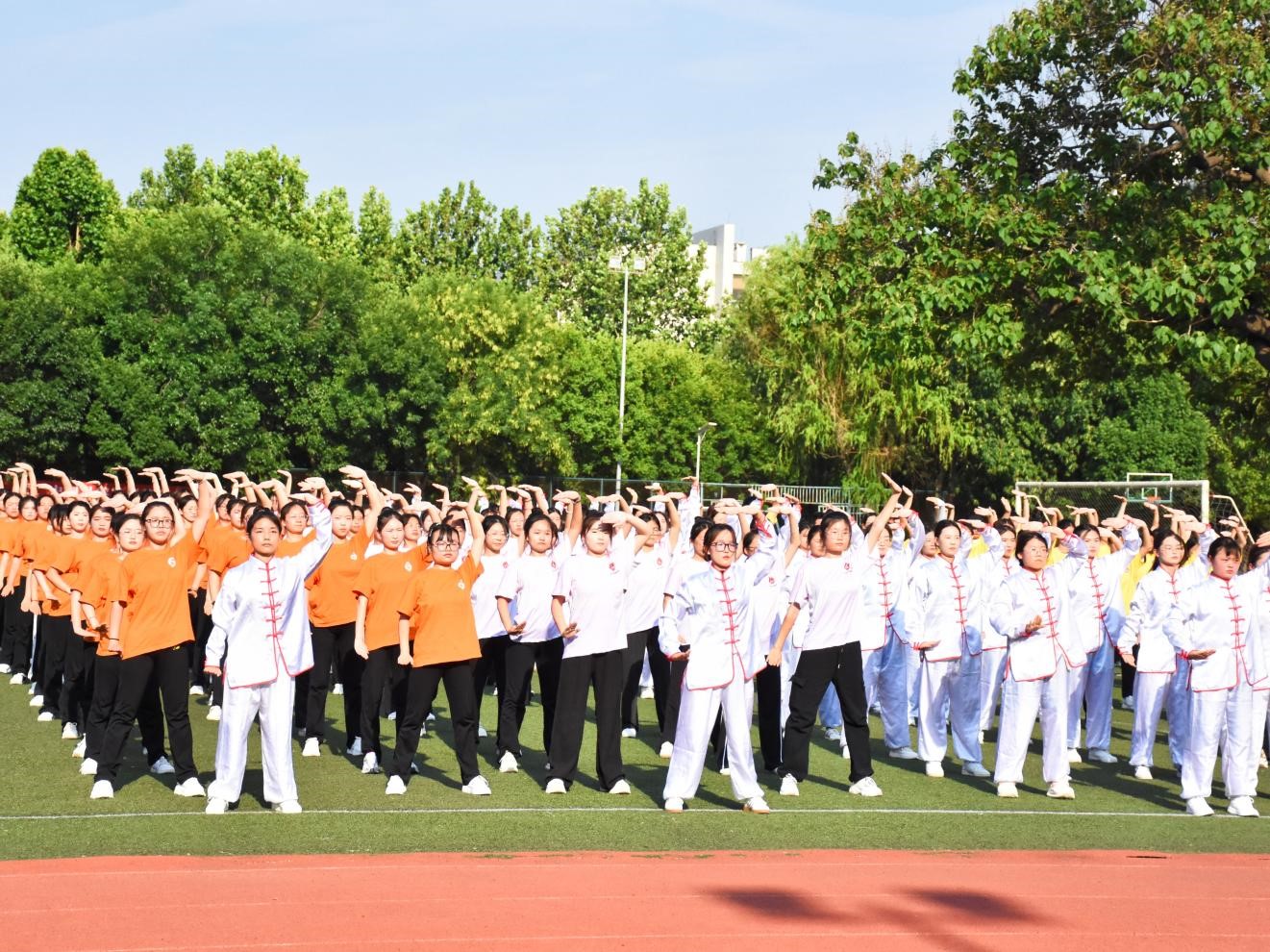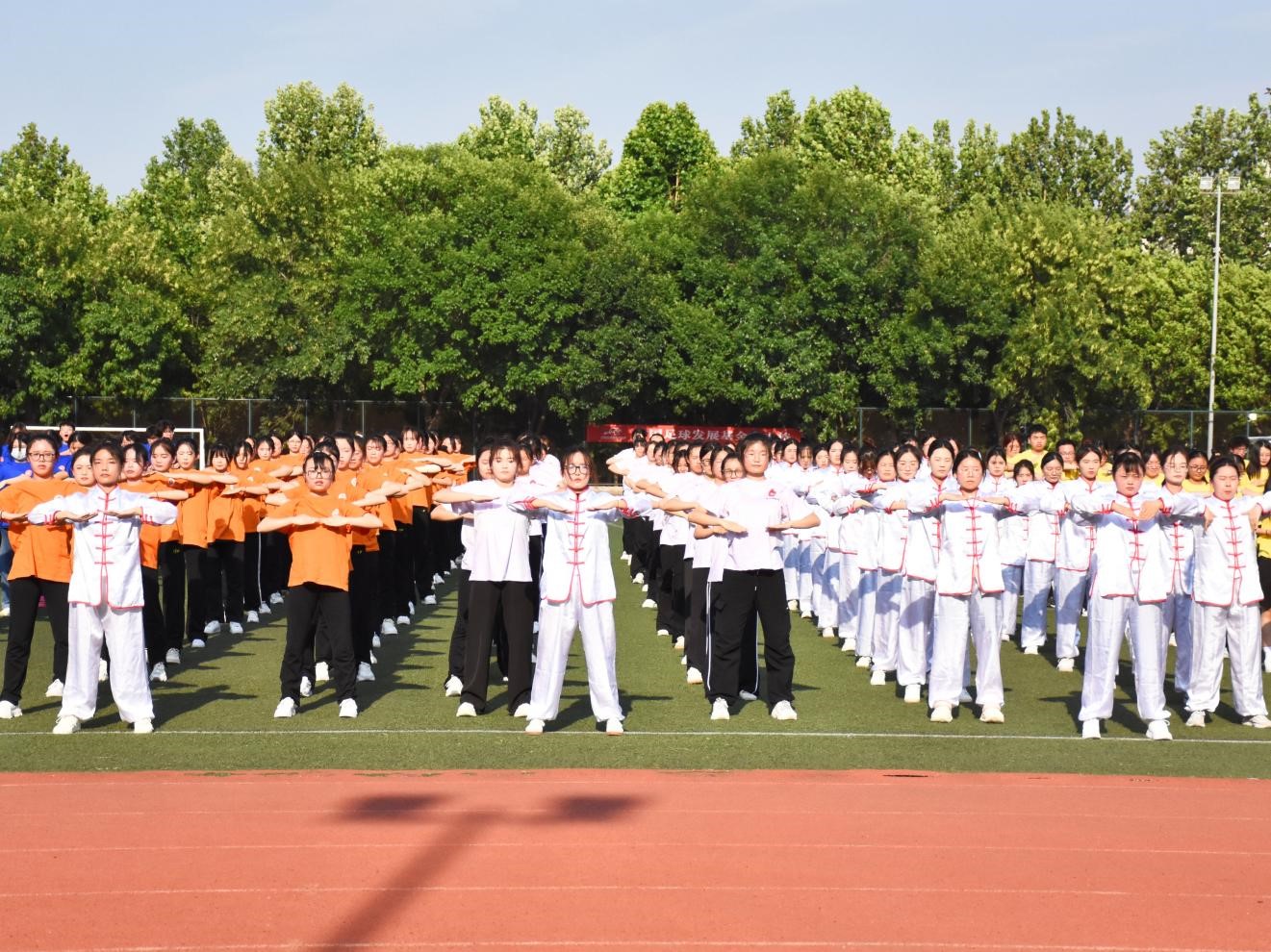 赛场上,同学们神采奕奕,身穿练功服列队走入操场。一式双手托天理三焦,胸臆舒展,气贯云霄;二式左右开弓似射雕,筋骨矫矫,英气滔滔。伴着八段锦的悠扬音乐,同学们身形姿态动静相容、刚柔并济,队伍配合条理有序、整齐划一。在八段锦行云流水的动作中,同学们感悟着八段锦内在无穷的魅力,找寻着心灵合一的内在宁静。赛场外,评委老师与志愿者根据队伍精神风貌、队伍整齐度、队伍规范度现场打分,认真评比。