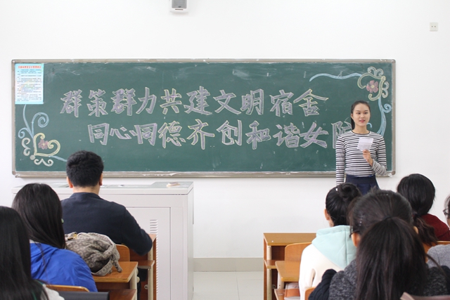 2016年10月24日,教育学院在博学楼302举行了“群策群力共建文明宿舍,同心同德齐创和谐女院”优秀宿舍表彰大会。教育学院团总支书记路敏老师、辅导员李娜老师、陈鹏飞老师以及各班卫生委员、优秀宿舍代表参加了此次活动。