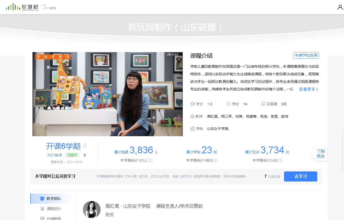 高红星教授主持的《幼儿园玩教具制作》在山东省高等学校在线开放课程平台上线