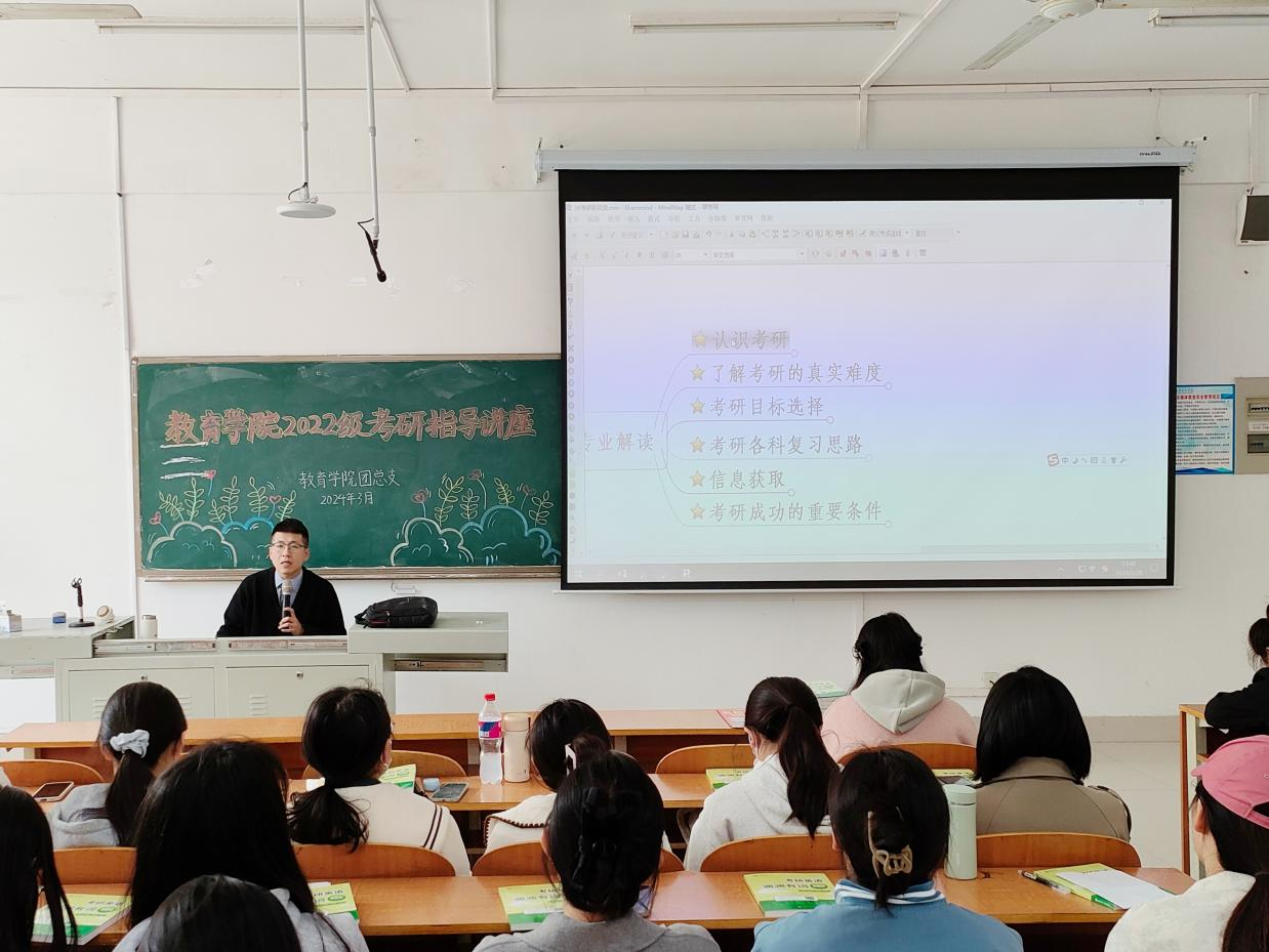 为帮助我院学生增强考研意识、规划考研之路,3月28日,教育学院于博文楼101举办2022级考研指导讲座。本次活动由高联教育胡强老师主讲,百余名有考研意向的学生参加。