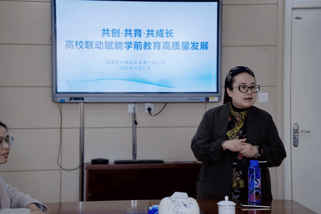 在参观交流与专题研讨环节,三方围绕学前教育创新与民族团结教育展开深入对话。历城区机关第一幼儿园名辉园李倩园长分享了“无边界课堂”的创新实践,高新区珑悦幼儿园马杰园长介绍了以中华优秀传统文化为根基的“悦艺”课程及其非遗融入路径。教育学院傅晨教授结合学校“为老・为小・为家”育人特色,分享了中华民族共同体意识融入学前教育的思考与探索。各方一致认为,高校与幼儿园的深度协同,有助于推动教育理论与一线实践的融合互促,为幼儿全面发展注入持续动力。