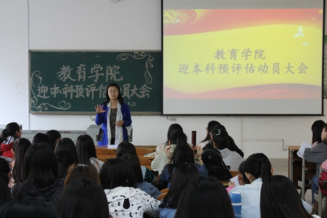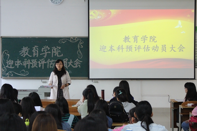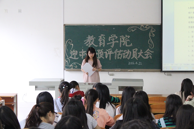 2016年4月21日下午,教育学院于博文楼104室召开迎本科预评估动员大会。会议由教育学院党总支书记田莉春主持,教育学院团总支书记路敏,辅导员王春晓、李娜,团总支学生会自律会部分学生干部以及13-15级各班班委参与了本次会议。 会议伊始,田书记首先强调了本次诊断性评估对于我院发展的重要性,并讲解了专家考察内容、如何考察、同学们在学风建设、文明礼仪、文明课堂、文明就寝、文明交往等方面的要求,并希望各位学生干部强化责任意识,发挥模范带头作用,及时向全班同学传达本次会议内容,希望同学们积极行动起来,以饱满姿态迎接评建工作。随后,路老师和王老师从专家访谈的角度就学院发展、人才培养目标、学生第二课堂、教学实践、宿舍环境等方面为同学们梳理了思路,统一了认识,与会学生代表纷纷表示要与学校一同承载责任,在即将到来的评建工作中贡献力量,为学院建设添砖加瓦。(路敏、高敏)