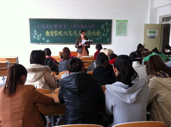 3月30日下午5时,山东女子学院第一次学生代表大会教育学院代表选举动员大会在普教楼406召开。教育学院团总支书记路敏、辅导员刘晓丽老师及各班班长、团支书参加了会议。会议由刘晓丽老师主持。 会上,路敏老师阐释了选举学生代表的意义及本次选举动员大会的主旨。刘晓丽老师详细介绍了关于各班开展选举工作的细则。会议过程中各班负责人认真记录,表示将以公平、公开、公正的态度严肃、积极地开展此项工作。 本次动员大会充分调动了同学们的参选热情,相信各班一定会认真落实会议精神,选出真正为同学、为学校办实事的学生代表。