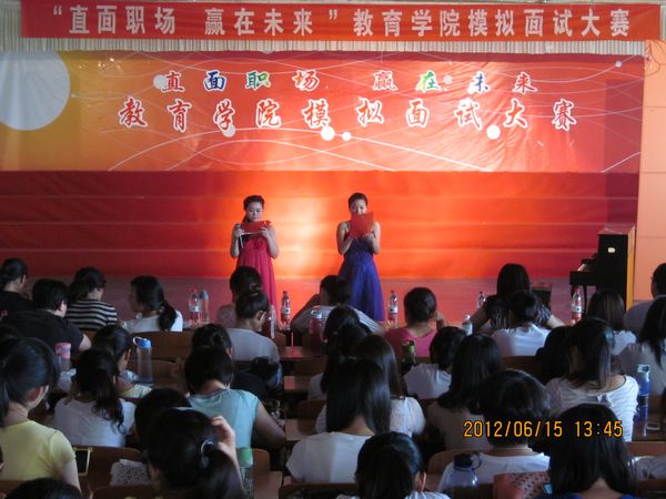 6月14日,“直面职场 赢在未来”教育学院模拟面试大赛在第二教学楼508室成功举行。本次比赛由教育学院团总支主办。学校招生就业处科长任晓剑、教育学院党总支书记田莉春、党总支组织委员吴博出席活动。教育学院王海霞、张天乐、路敏、刘晓丽、翟斐老师担任比赛评委。 经过初选,共20名选手入围决赛。本次比赛模拟幼儿园面试现场,共分为简历投递、自我介绍、才艺展示、面试问答、面试官点评五个环节。从独特的自我介绍到犀利的面试问答,选手们各展风采,用歌曲、舞蹈、钢琴等丰富多彩的形式博得了现场评委的好评,充分体现了宽阔的知识面、扎实的专业技能和良好的心理素质,赢得了现场观众的阵阵掌声。经过激烈角逐,共产生一等奖一名,二等奖三名,三等奖六名,优秀奖十名,优秀简历制作奖二名。 本次比赛提高了我院应届毕业生的就业竞争力,有利于提高同学们的应聘和就业技巧,增强心理素质,为即将走出校园的学子提供一个模拟求职的考场。