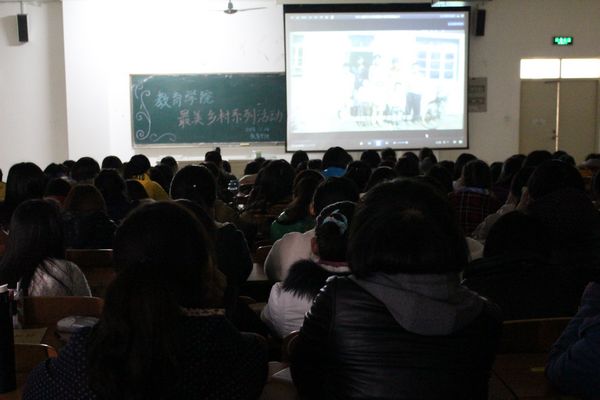 为全面贯彻落实党的十八大精神,深入推进社会主义核心价值体系建设,进一步提升我院大学生的道德自觉,教育学院团总支于11月14日下午,在2号教学楼310室开展了第二届“探寻最美教师 感悟爱的力量”主题教育系列活动。 “寻找最美乡村教师”是由中央电视台与光明日报社联合发起的大型公益活动。迄今已举办了三届。会场上,大家怀着感动和敬畏之心观看了《2013寻找最美乡村教师颁奖晚会》,看着荧幕里各种令人动容的瞬间,聆听着他们感人的事迹,在座同学深深感受到这些平凡老师最美的人格魅力,“为了残疾学生、决不放弃的承诺”的仲威平、“夫妻小学到隔山相望”的廖占富 张兴琼,一个个最美乡村教师不为名不为利、默默奉献的职业情操,永不服输的人生信念震撼着在场所有人的心灵,让在场的许多同学不禁落泪。观后,同学们纷纷表示今后要为人师表,把最美人生奉献给孩子,用爱心点燃希望。 据悉,此次活动是教育学院本学期的特色活动之一,与第一届相比,内容更加充实,形式更加丰富,共分为“感知美丽、践行美丽、传播美丽” 三个阶段,内容包括:“师生情·中国梦”观影征文活动、“最美”班级、团支部评选、“学楷模·铸师魂·践行动”ppt大赛等。