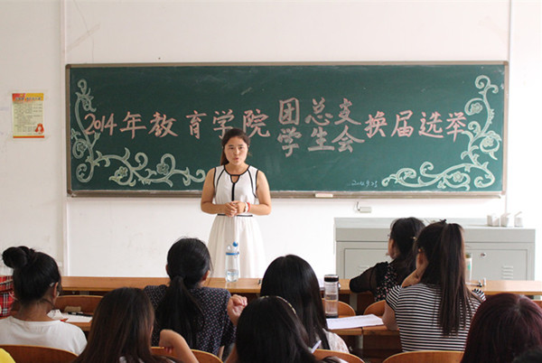 继往开来,续谱新篇。9月25日,教育学院2014届团总支学生会换届工作于2号楼拉开帷幕。本次换届大会由教育学院团总支书记路敏、王春晓、12级团总支学生会老干部以及13级有竞选意愿的全体成员出席会议。 下午13:30分,会议准时开始。整场会议以“公平、公正、公开”为原则,在严肃认真的氛围下有序展开。此次竞选的方式为民主评议,首先由经过了组织报名、资格审查之后的参选人员上台演讲,继而由两位老师以及主席团的各位主席、往届部长根据参选人员的现场表现及平时工作表现予以现场投票。演讲台上,每一位参选人员都沉着冷静、自信满满,他们用流利的话语把自己的竞选优势和竞选动力娓娓道来,从容地向各位评委老师展现出工作中、生活中最真实的自己。无论是对自己部门的认知,还是对于整个学生会的看法,每一位参选人员都有自己独到的见解。整个竞选过程中,各位参选人员表现精彩,赢得现场老师以及主席团成员、各部部长的一致好评。前来竞选的干事们,都向我们展现出了一个“和谐、健康、积极、文明”的学生会集体。 本次集中面试持续近3个小时,参加竞选的60名同学分别表达了加入团委、学生会的愿望和为学校同学服务的决心,展示了我校莘莘学子朝气蓬勃的精神面貌。后路敏老师总结了这次换届大会,她表达了对教育学生会的热切期望和美好祝愿。同时,她还对往届部长表达感谢,感谢各成员曾对教育学院发展付出的努力。 至此,学生会换届工作圆满结束,此次换届大会的成功举办,不仅为团委、学生会注入了新鲜血液,也对今后团委各项工作的顺利进行奠定良好基础。