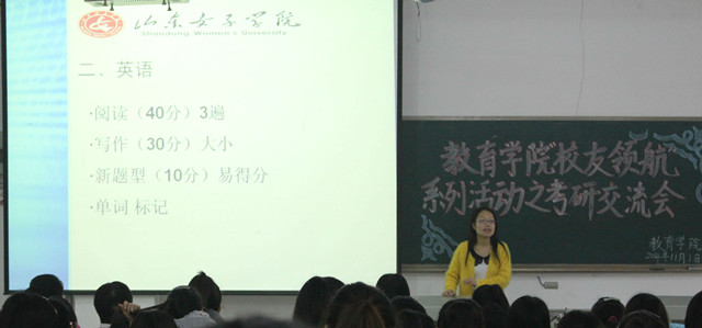11月1日上午9点,教育学院在2号教学楼110教室举办了“校友领航”活动之考研交流会。会议邀请了山东师范大学研究生、我校优秀校友冯延玲、管晶晶两位同学为大家分享了考研经验。 会上,冯延玲同学从考研课程、试卷结构,答题方法、注意事项、参考书目以及临考时的心态等方面为大家做了一一介绍。她告诉同学们,考研必须要有扎实的基本功,要有足够知识的储备,另外,临考时的心态也非常重要,稳扎稳打的心态是决胜的前提和基础。随后,管晶晶同学针对在座的不同年级的学生所面临的问题给出了具体明确的指导,尤其是针对即将走进考研考场的同学做了更加深入的交流。最后两位同学对同学们提出的问题进行了答疑,使同学们对考研有了更清楚的认识。 此次考研交流会为考研学子搭建了交流的平台,既展示了我院考研成功学子的实力和风采,又为即将考研的同学带来信心和动力,活动中大家踊跃发言,交流心得,气氛融洽热烈,本次交流会取得了圆满成功。(路敏、张元)