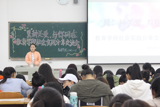 2016年10月19日,教育学院于博文楼108室举办了“‘翼’种关爱,与你同在”社会实践分享交流会,15、16级各班班长、团支书及部分优秀社会实践报告成员代表参加了活动。本次活动由副主席吕巧丽主持。