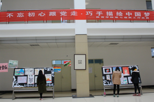 12月4日-12月12日,教育学院在博文楼一楼大厅举办了“不忘初心跟党走·巧手描绘中国梦”第七届美工作品展。此次作品展由教育学院团总支主办,以庆祝党的十九大胜利召开为契机,通过“献礼十九大”、“推进廉政文化进校园”、“弘扬社会主义核心价值观”等主题性美术创作,描绘先进人物、传播先进文化,展现了青春学子积极向上的精神风貌。