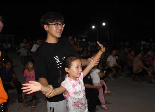 大家众说纷纭,莫衷一是。一时间,汇演陷入了僵局。陆续开始有村民离开,看着舞台下面的观众越来越少,志愿者们也是看在眼里,急在心里。于是,志愿者们灵机一动,大家手牵手走上舞台,打开手机的手电筒,唱起了彼此熟悉的歌曲。当“池塘边的榕树上……”那熟悉的旋律响起时,有不少即将要走的村民纷纷停下了脚步,回头驻足。从《童年》,到《后来》,再到《隐形的翅膀》,志愿者们挥舞着的闪光灯,就像夏夜里一只只飞舞的萤火虫。是的,志愿者们就是一群萤火虫,他们愿意发挥他们的光和热,去温暖,去守候,在无尽的黑暗中,尽自己最大的努力,为大家带来一丝丝的光芒。那一刻,每位志愿者都是天使。