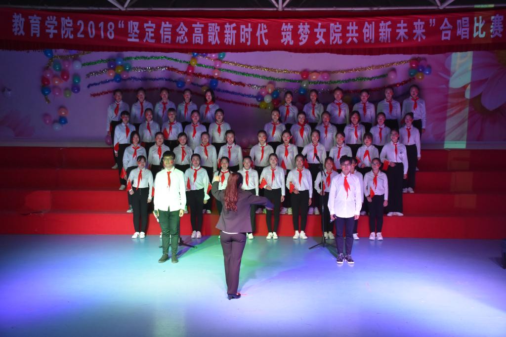 比赛现场,24个参赛班级精神抖擞,队列整齐。各参赛班级通过演唱必选曲目《山东女子学院校歌》表现了教育学院学子对女院的热爱对女院未来的希冀。随后的自选曲目则创意十足,特色鲜明。比赛中,同学们不仅仅深情演绎了《国家》、《相亲相爱》立意鲜明、催人奋进的歌曲,更以饱满的激情完美演唱了《最初的梦想》、《明天会更好》等流行歌曲。17级春考班一首《我爱你,中国》嘹亮,表达了对伟大祖国的热爱之情;17级学专二班带来的《凤凰花开的路口》悠扬的音乐带领观众追寻美好的回忆;18级学前的《鼓浪屿之波》运用古筝之音作为伴奏,乐声悠悠,完美的演唱收获了一片掌声。嘹亮的歌声、多变的队形、优美的伴舞、气势磅礴的朗诵,将教育学院学子的多才多艺展现的淋漓尽致。最后,比赛在陈雪带来舞蹈《起风了》以及魏明睿带来歌曲《天耀中华》中落下了帷幕。
