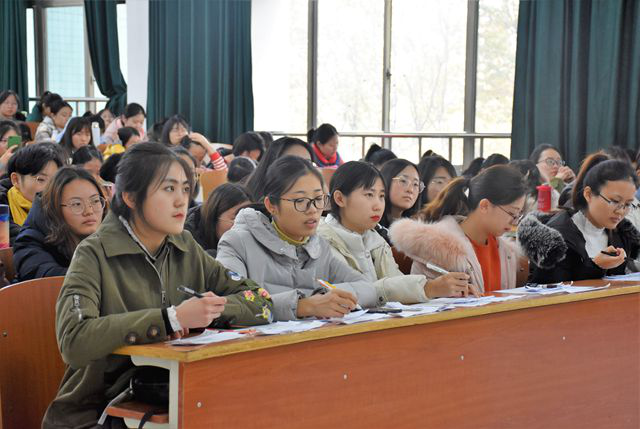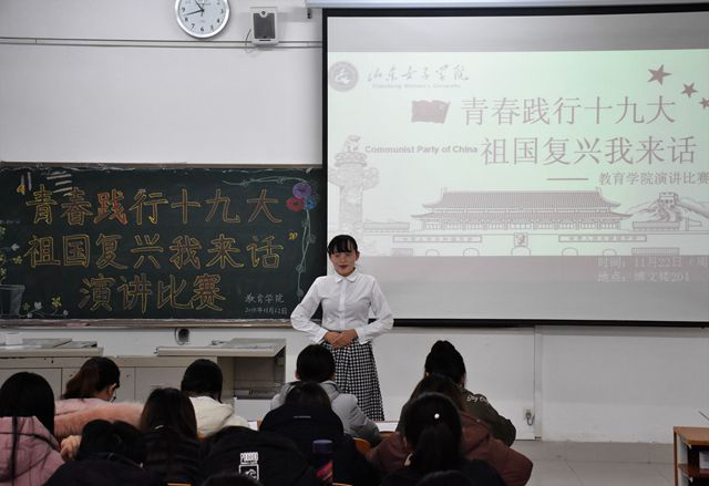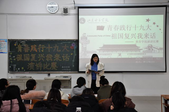 2018年11月22日下午14:00,山东女子学院教育学院于博文楼204举办“青春践行十九大,祖国复兴我来话”演讲比赛。教育学院学生会副主席高峻峻、李娅菲、新媒体中心副团长孙志新、新闻采编部部长霍雯娜、心理部部长曹彤彤、学习部部长马晓君、张宇一同出席了本次演讲比赛,并担任本次比赛的评委,部分教育学院学生到场观看。