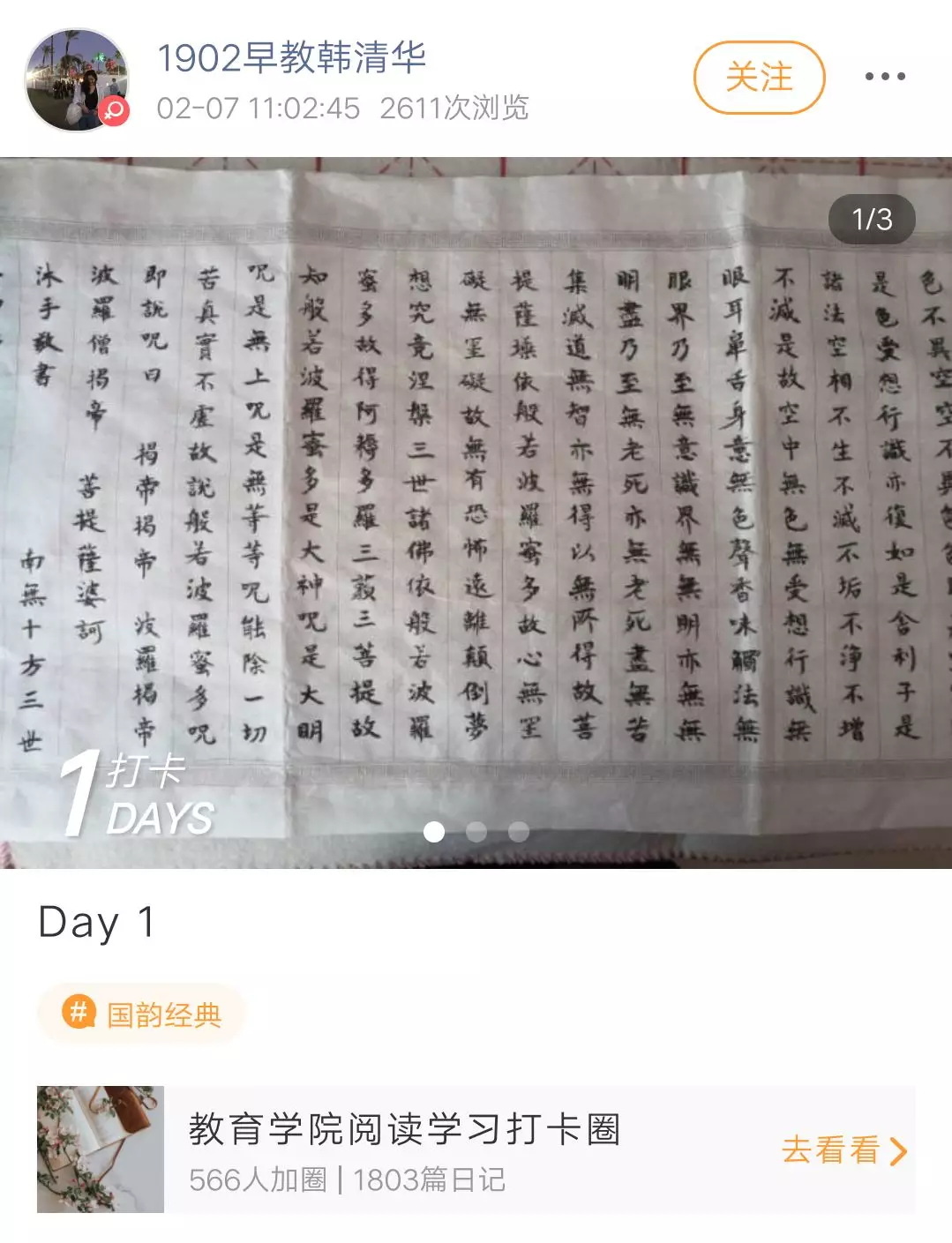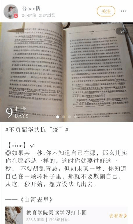 为此,山东女子学院教育学院开展“21天阅读打卡”活动,建立线上阅读打卡圈,我们每周都会从中挑选精彩内容推送给大家。活动已经进行了三分之一,下面先来看看打卡情况吧!