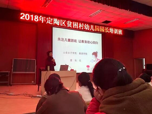 11月16日,根据学校工作安排,结合学校组织部工作部署,教育学院董旭花教授和刘源博士前往我校“第一书记”驻村所在地定陶区实验幼儿园,为定陶区300余位村办幼儿园园长开展了为期1天的业务培训。定陶区教育局副局长李兆峰、学前科科长徐兰云出席本次培训。