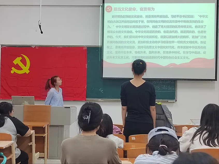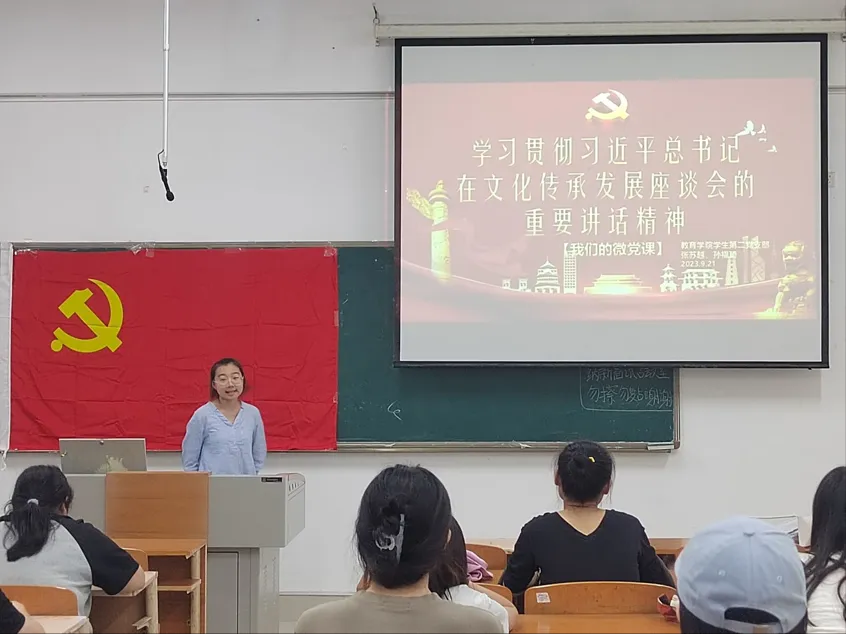 为更好学习领会习近平总书记关于文化建设提出的一系列新思想、新观点、新论断,更好担负起新的文化传播传承使命。2023年9月21日下午,山东女子学院教育学院学生第二党支部在博文楼117召开“坚定文化自信 建设文化强国——学习贯彻习近平总书记在文化传承发展座谈会的重要讲话精神”主题微党课,教育学院学生第二党支部全体党员参加本次活动。