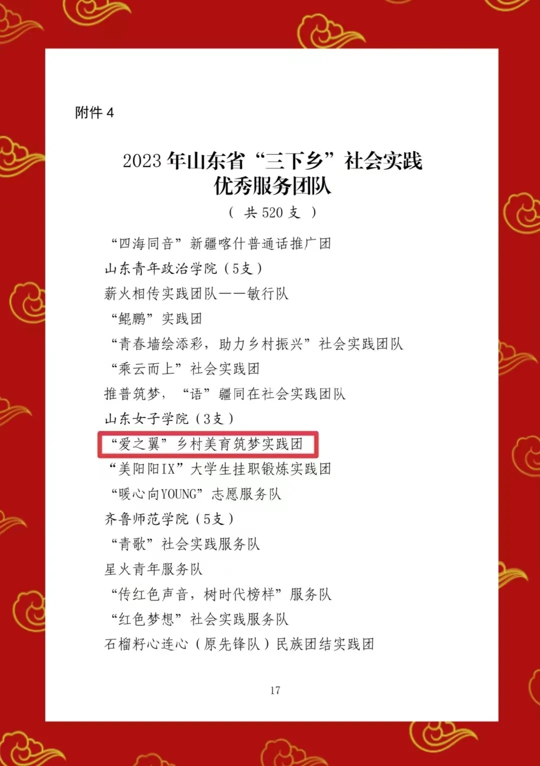 近日,在由团省委联合省委宣传部、省文明办、省教育厅等单位举办的以“学习二十大 永远跟党走 奋斗新征程”为主题的“调研山东”--暑期“三下乡”社会实践活动中,山东女子学院教育学院团总支荣获优秀组织单位的称号,教育学院指导老师王冬玉、李英斌、宫翠萍以及多位教育学院优秀学生分别荣获优秀指导教师和优秀学生的称号,爱之翼”乡村美育筑梦实践团荣获优秀服务团队的称号,山东女子学院“青春有‘翼’,筑梦未来”乡村美育志愿服务项目更是荣获优秀服务基层实践项目的称号,成为我校唯一组织单位、指导教师、学生、服务团队、服务基层实践项目五项均有斩获的“大满贯”团队