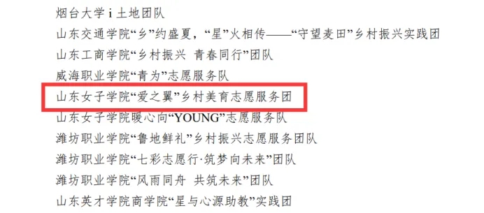 在由团中央青年发展部、中国青年报、中国青年网联合举办的2022年全国大中专学生志愿者暑期“三下乡”社会实践“镜头中的三下乡”成果遴选活动中,山东女子学院教育学院“爱之翼”乡村美育志愿服务团获得优秀文字团队奖,指导教师宋天娇、学生邵晓薇分别获得优秀指导教师和优秀通讯员奖。