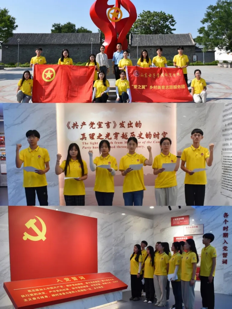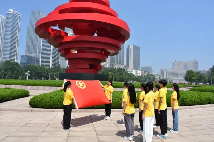 图为“爱之翼”乡村美育志愿服务团队员们在五四广场前重温入团誓词。