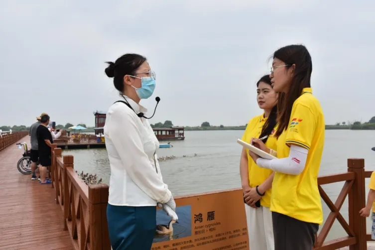 图为“爱之翼”乡村美育志愿服务团队员们从黄河变迁、生态保护、青年责任等方面对黄河保护区的负责人员进行采访。