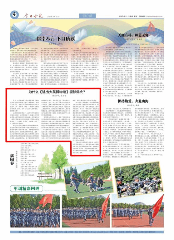 近日,2023年度山东省高校校报优秀新闻作品奖获奖名录公布,校报《今日女院》荣获一等奖1项,二等奖1项。教育学院学生宋莹莹撰写的《为什么<逃出大英博物馆>能够爆火?》获新闻评论类一等奖。